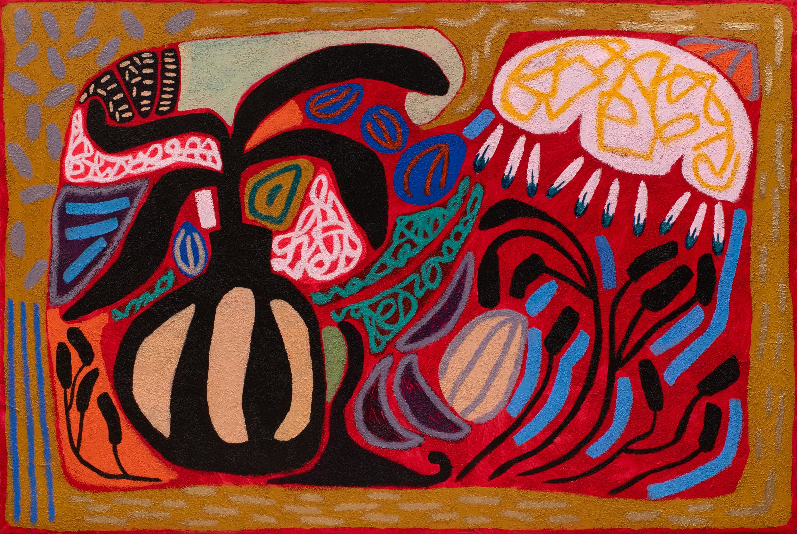 Nature morte stylisée et colorée sur fond rouge, évoquant des plantes et/ou fruits.